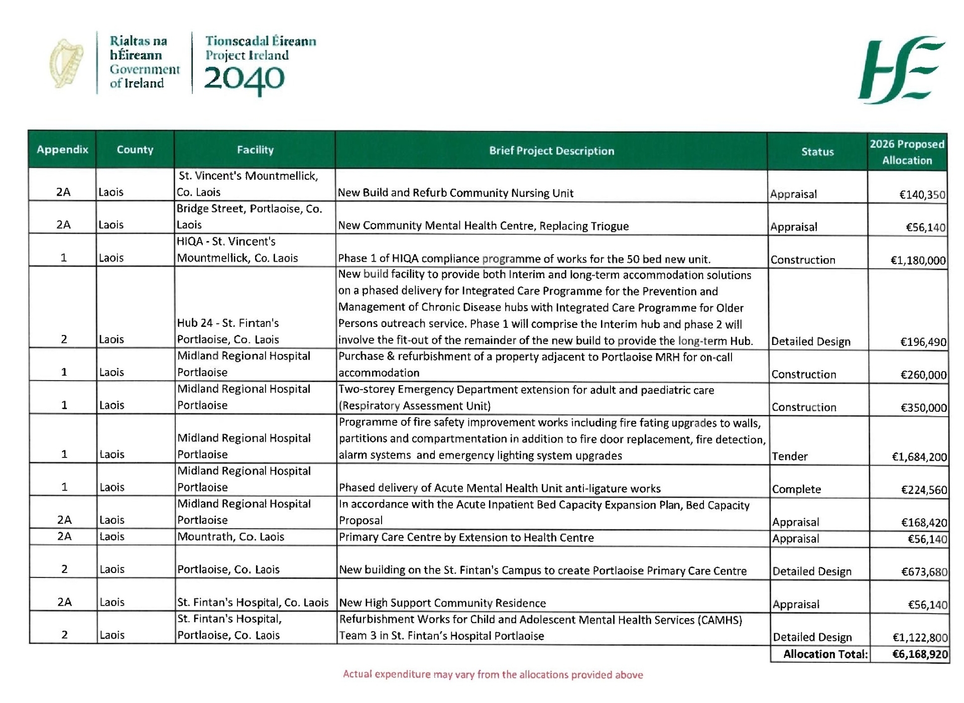Funding is also being provided to appraise the next phase of work promised at St Vincent's in Mountmellick, where more new beds are planned. The €140,350 allocated to the project also includes consideration of how to refurbish existing facilities.
