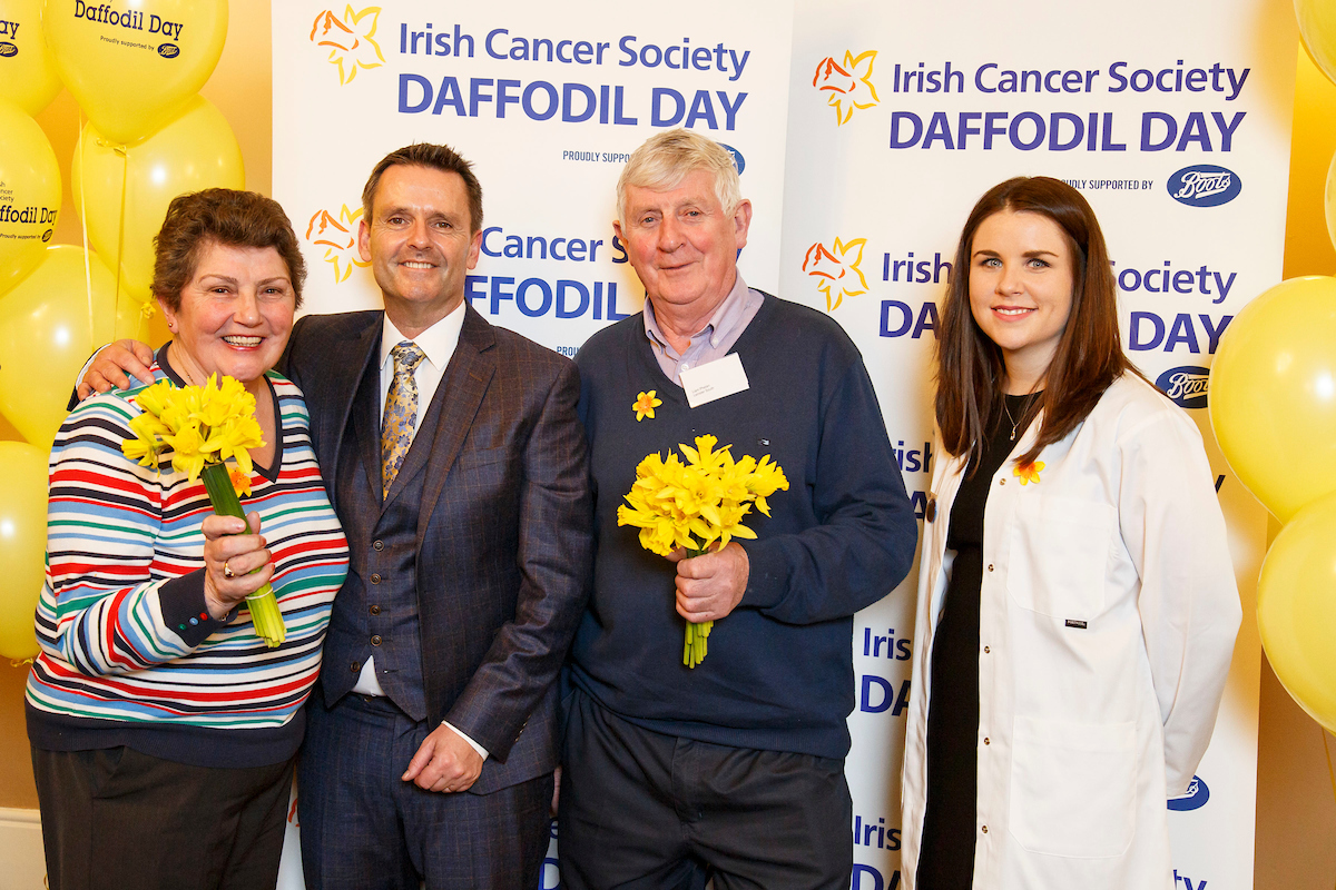 Irish Cancer Society Daffodil Day volunteers Bernie and Liam Phelan, from Mountrath, Co Laois, joined RTÉ’s Aengus Mac Grianna and Boots Irish Cancer Society Information Pharmacist Clare O’Neill (far right).