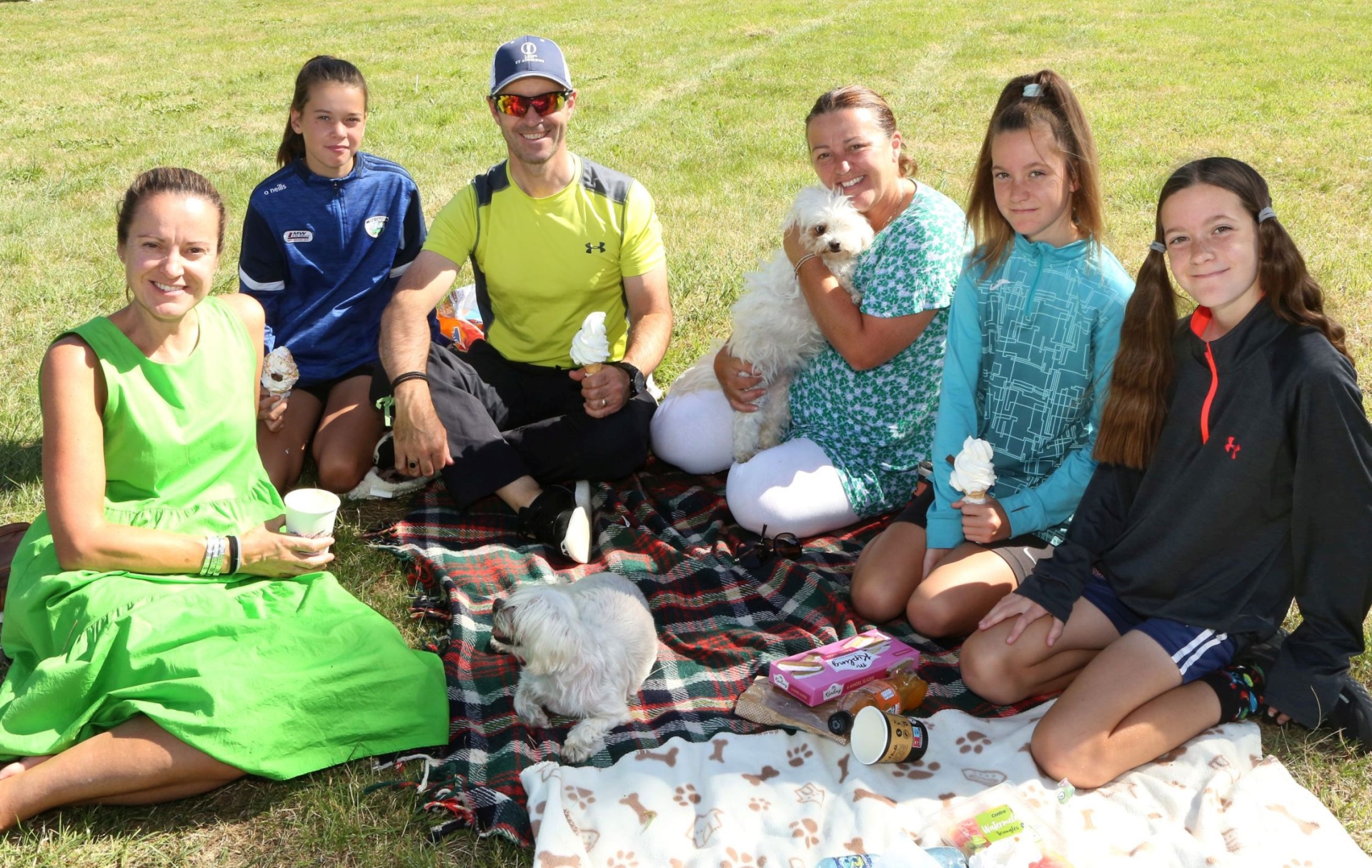 At the Teddy Bear's Picnic and Music Event at The Heath House in aid of Laois Offaly Families for Autism and Ukranian Refugees, were: Catherine, Cliona and Eamonn O'Flanagan,Therese Ryan, Lauren and Olivia O'Flanagan wit dogs Rolo and Aero. Photo: Michael Scully.