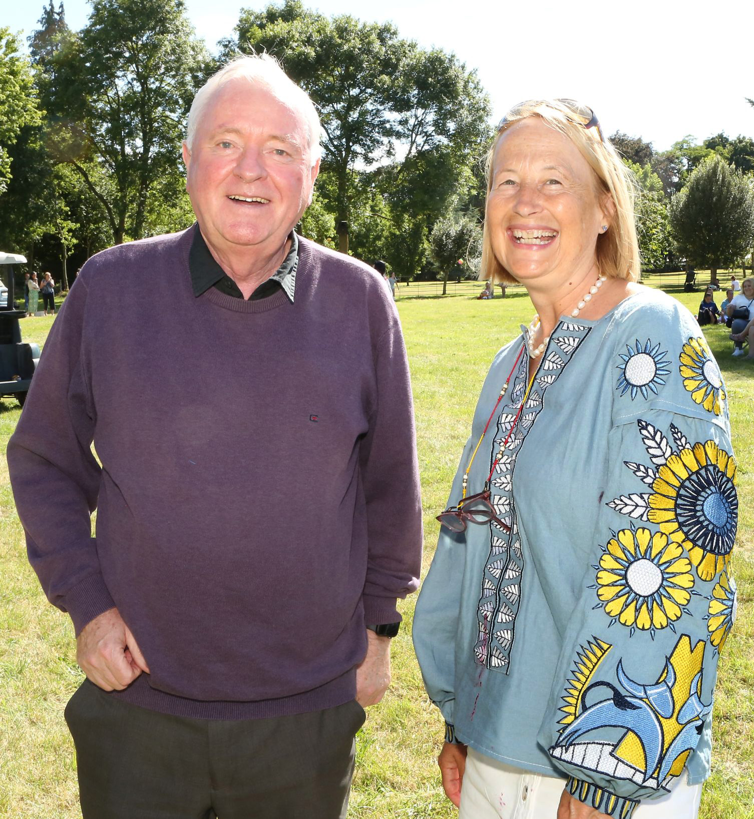 At the Teddy Bear's Picnic and Music Event at The Heath House in aid of Laois Offaly Families for Autism and Ukranian Refugees, were: Mons. John Byrne and Roisin Hussey ( host ) . Photo: Michael Scully.