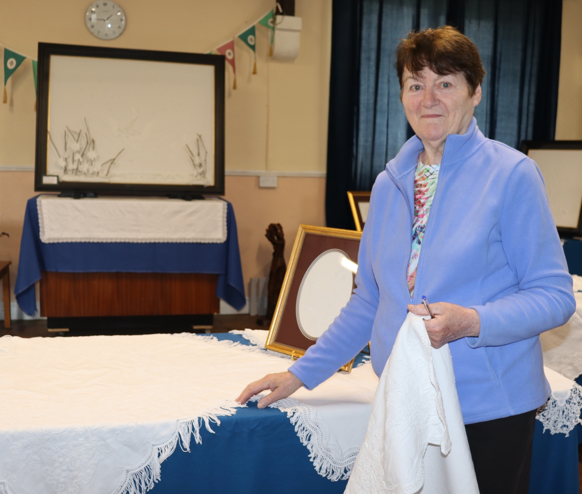 Mary O'Brien, Mountmellick Heritage Society with a piece from her extensive collection of Mountmellick craftwork and photographs, on exhibition in St Paul's old schoolhouse.