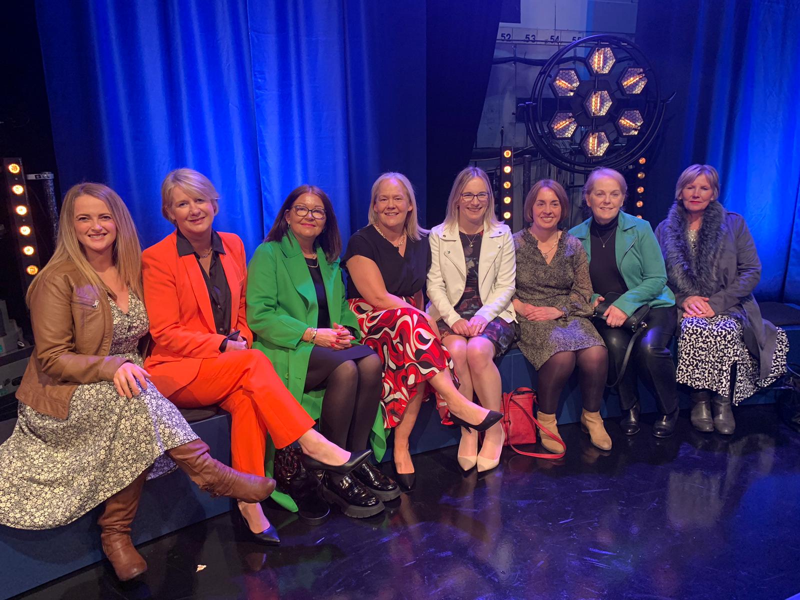 Below: Shona Phelan, Esther Luttrell, Valerie Sheehy, Kathleen Sheridan, Susanne Scully, Anne Buggie, Ann Simpson, and Marie Kinsella at the OT season finale in RTE.