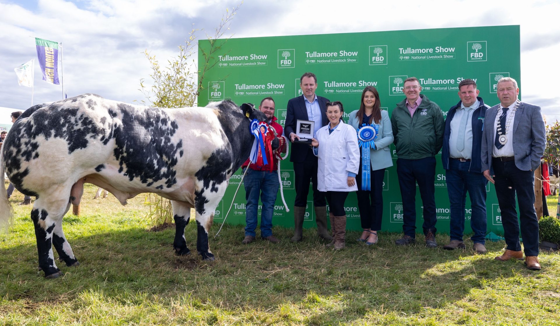 The reserve champion Pedigree Belgian Blue owned and shown by Billy Dunne and Grainne Higgins from Errill, Co. Laois are presented with the awards by Minister for Agriculture, Food and the Marine Charlie McConalogue TD; Chelsey Cox-McDonald, show secretary; Pat Gilligan FBD; Kalen McNamara, head of pedigree and Ray Brady, ISA president at Tullamore Show 2023.