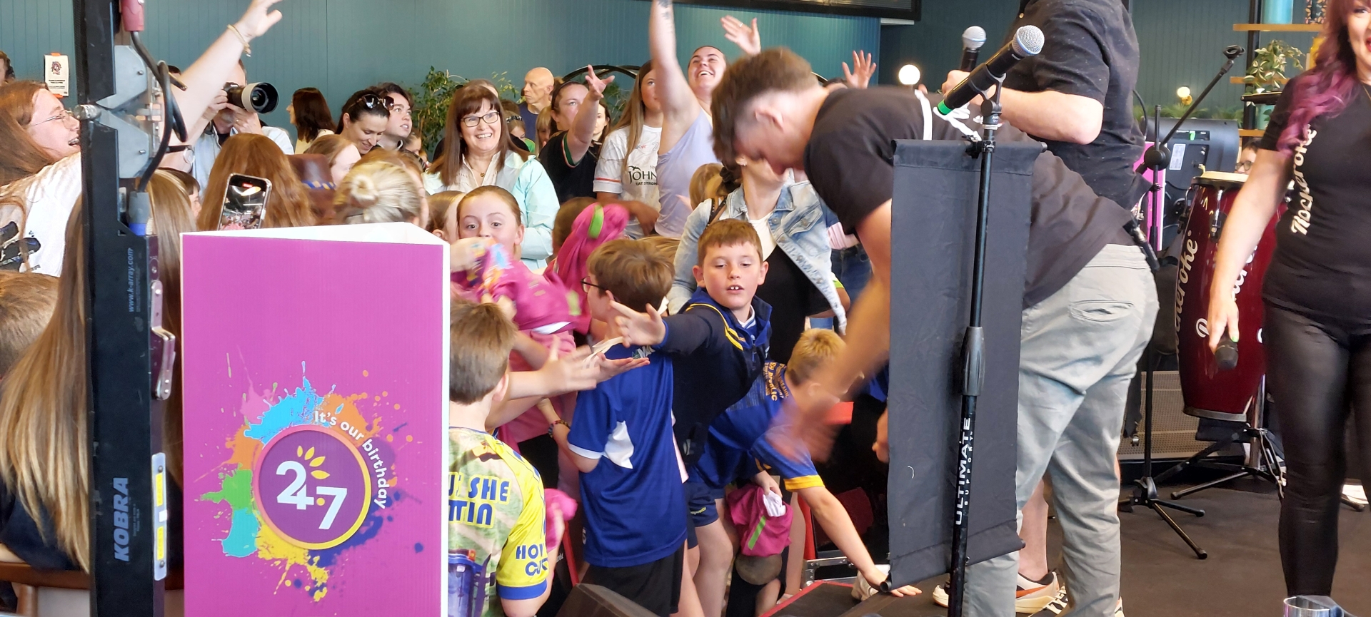 Crowds grabbing giveaways from The 2 Johnnies at the 24/7 Applegreen birthday party in the Midway Portlaoise.
