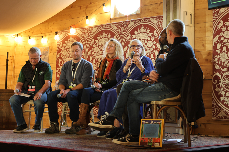 Laois women Kitty Allen gardener and presenter and Darina Allen chef, author and owner of Ballymaloe on the Food Security discussion panel, with Kenneth Keavey and Paul Brophy. Photo: Annie Holland