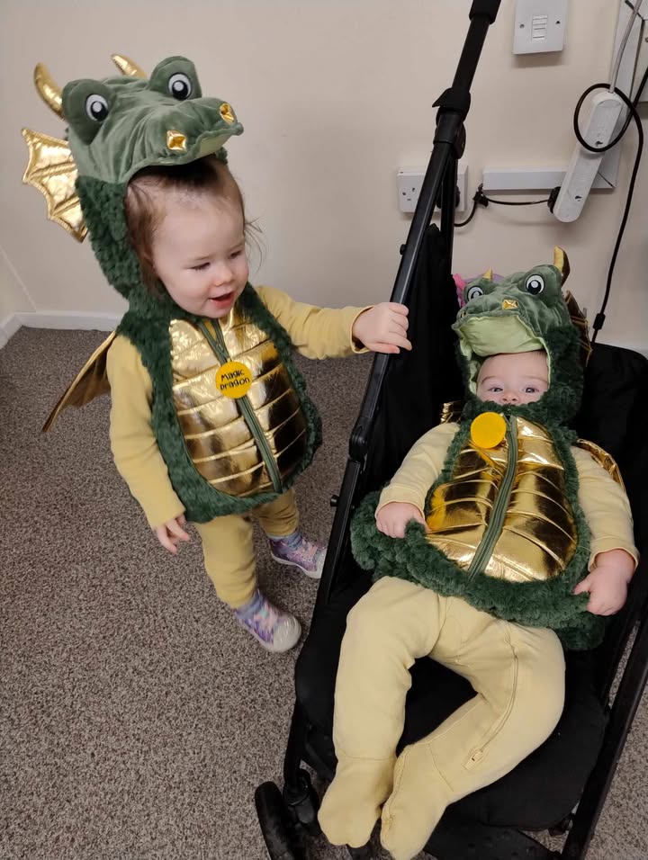 Pictured: a-roar-able: Ceili and Keith Johnson on their way to play group!