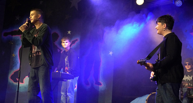 Mark, Vinnie, Patrick, and Shane rocking out to 'Self-Esteem' in their garage rehearsal headquarters.