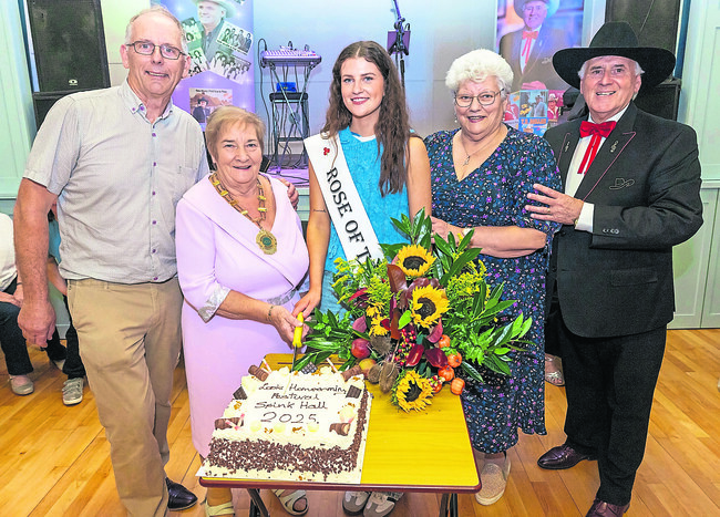 Spink Development chairman Michael McEvoy, Spink ICA president Helen Gee, The Rose of Tralee Katelyn Cummins, Spink Development secretary Anne Cass and TR Dallas cut the cake at the Lovely Laois Homecoming Festival Afternoon Tea Dance in Knock Hall, Spink. (Photo by Alf Harvey.)