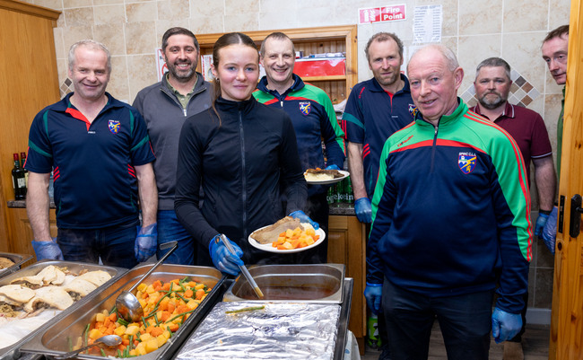 Keira Gorman dishing out the dinners for members of Spink GAA to serve at the Ballinakill and Knock Senior Citizens party in Knock Hall.