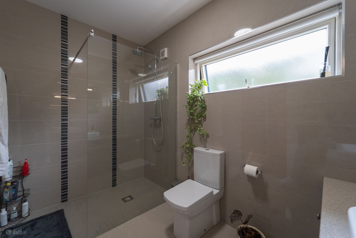 The family bathroom is meticulously finished, from the premium tiling that lines the space to the sleek walk-in rainfall shower. A bespoke vanity unit adds both style and functionality, completing a tranquil environment perfect for unwinding.