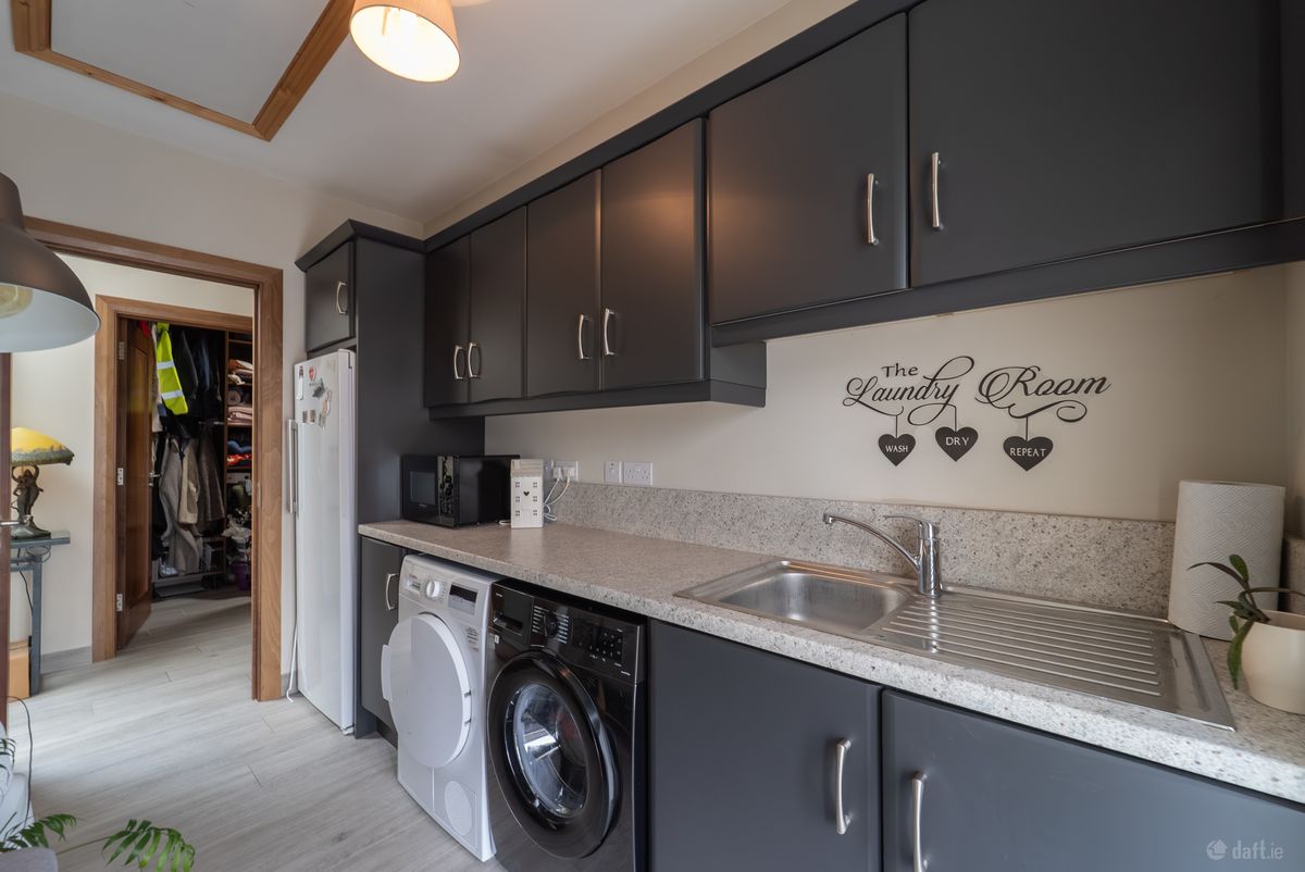 The galley-style utility room is designed for maximum efficiency, offering an abundance of storage while doubling as a practical boot room.