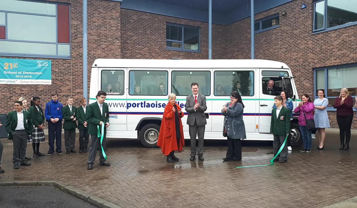 Video: Portlaoise College Principal Noel Daly launches their school bus, with Anne Fitzpatrick, Enva, Louise Dent, Parents Council, and students Fabien Anghene and Hristo Petrushkov.