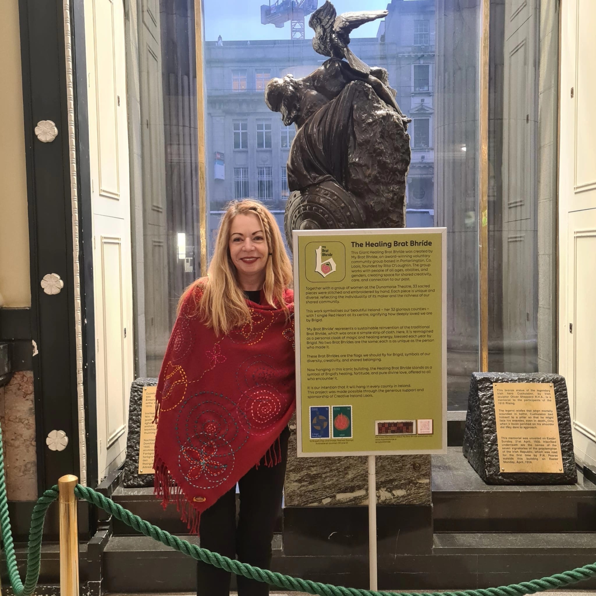 "I have helped them design a stamp of the St Brigid's cross in the past, this is a huge honor for all of us who worked on the brat bhríde. To know that it is a group of Laois women who have made this, is very special too. It is from Laois, and has made its way to the GPO.