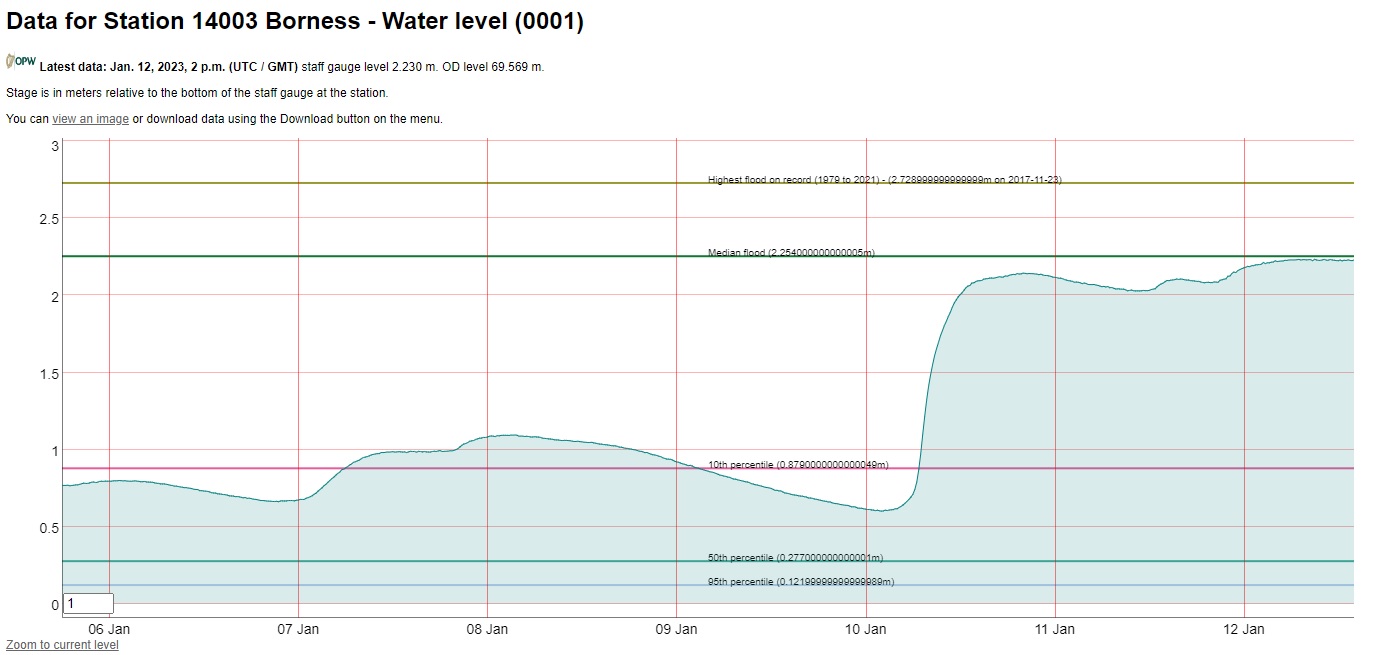 The OPW's statistics show that the Borness flood plains down the Barrow river towards Portarlington, reached flood level (green line) during the previous night and remain at the level through Thursday. (graph below).