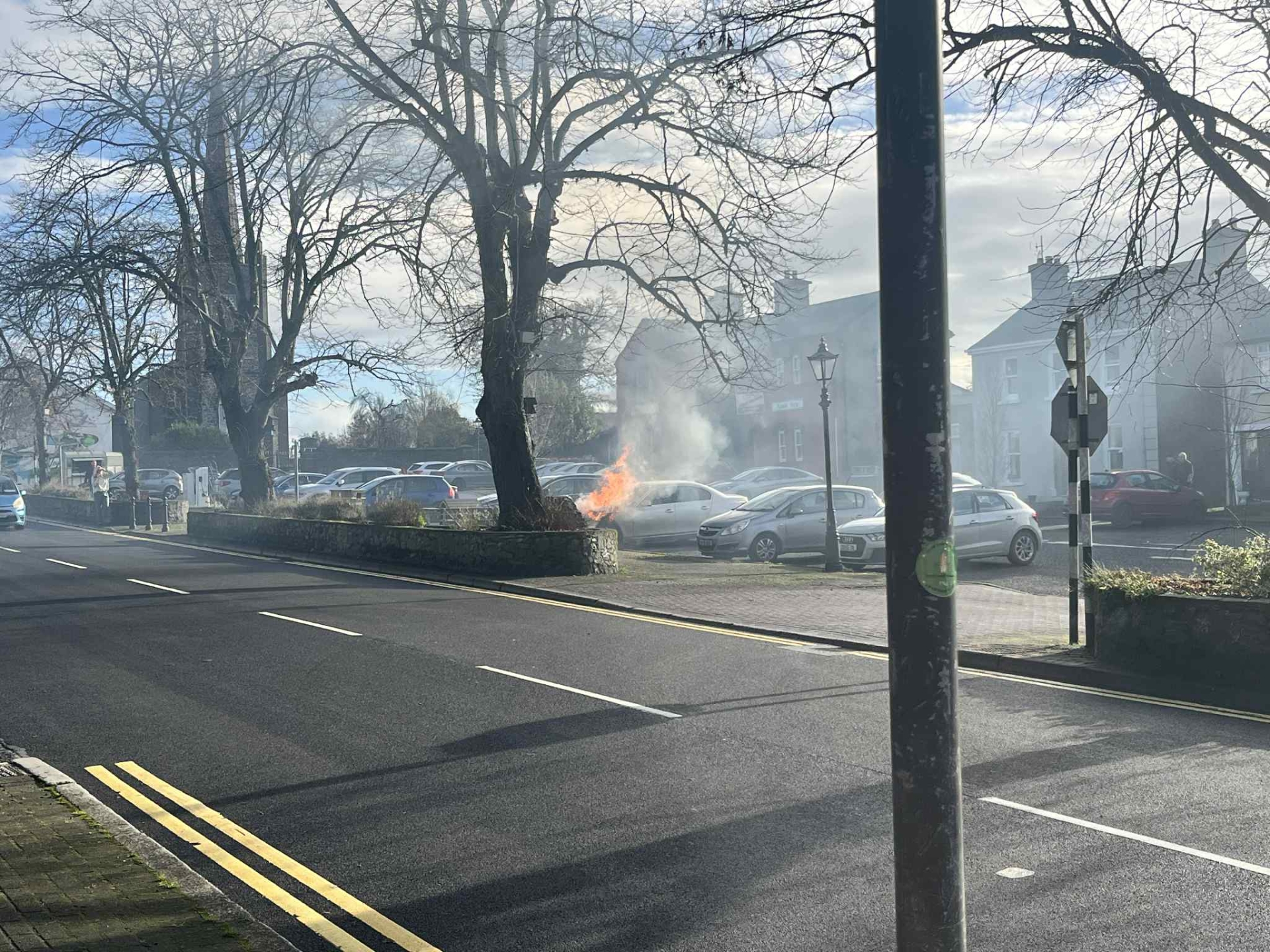 In dramatic scenes, a car erupted into flames in Rathdowney's town square at midday on Thursday.