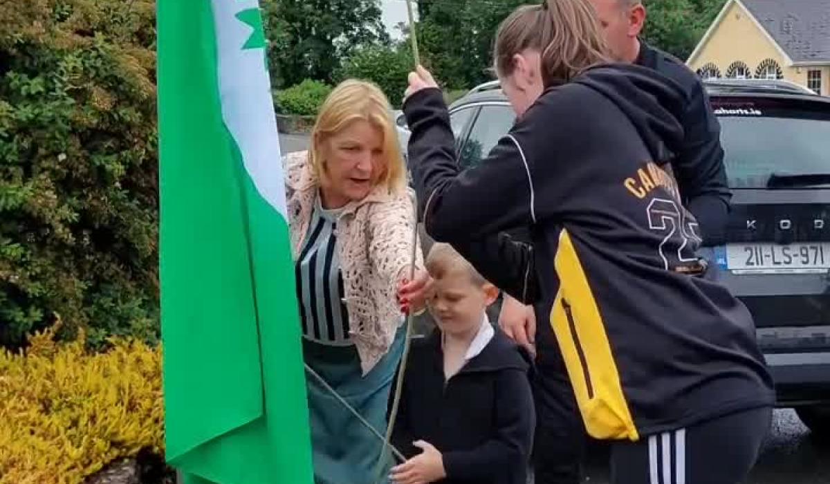 The honour of raising the flag at Camross National School is traditionally given to the oldest and youngest pupils. Amber Palmer O'Keeffe and Iarlaith Burke were helped by Green Schools Coordinator Ms Cordial to hoist it, but not without a hitch! The ceremony took place on Grandparents Day, June 12, and the Leinster Express / Laois Live was there to capture the excitement.